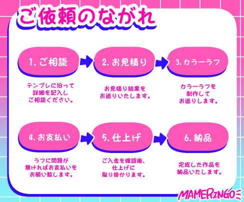 1.上記のテンプレートに沿ってご希望の内容を記載し、件名を「イラスト依頼希望」とし、当方のメールアドレス【omame4renraku123@gmail.com】までご送信ください。