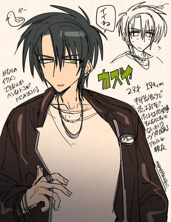 RosidS(二枚ある) アカルとカズヤ描いた アカルがアサヒと色々要素が被ってる(名前、金髪など)のフツーになんも意識してなかったんだけど、同じ世界線にしたのにこんな似てるキャラが無縁なのなんか違和感あるかなと思っていとこにしました 従兄って便利な設定 でもそんなに従兄同士のキャラ見ないよね?割と兄弟とかになりがちな気がする
